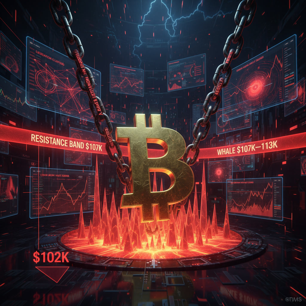 $102,000–$105,000: Primary test zone where liquidation clusters and potential demand align. Losing this level risks cascading long liquidations.