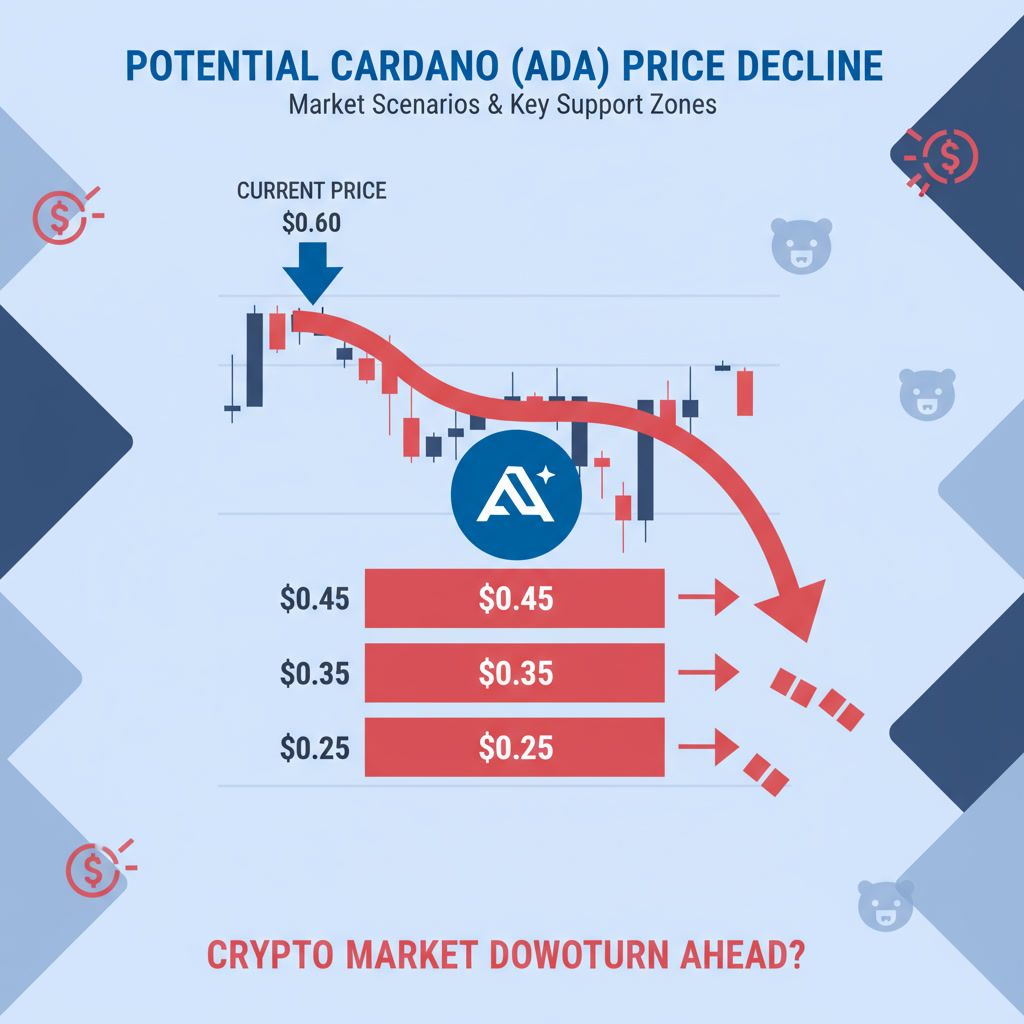 • Scenario 1 – Moderate decline to $0.35–$0.45: The most likely path (~60 % probability) is that ADA slides from its current ~$0.52 level to around $0.35–$0.45. This would represent a roughly 30-35 % drop.