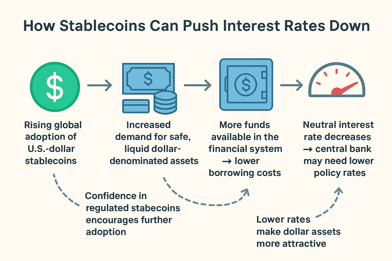 Because stablecoins increase demand for dollar assets and expand the supply of loanable funds, they can exert downward pressure on the neutral rate of interest — meaning that central banks may need to adjust their policy horizon.